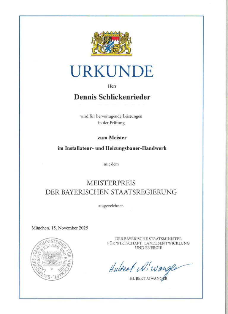 Meisterbrief: Installateur- und Heizungsbaumeister.